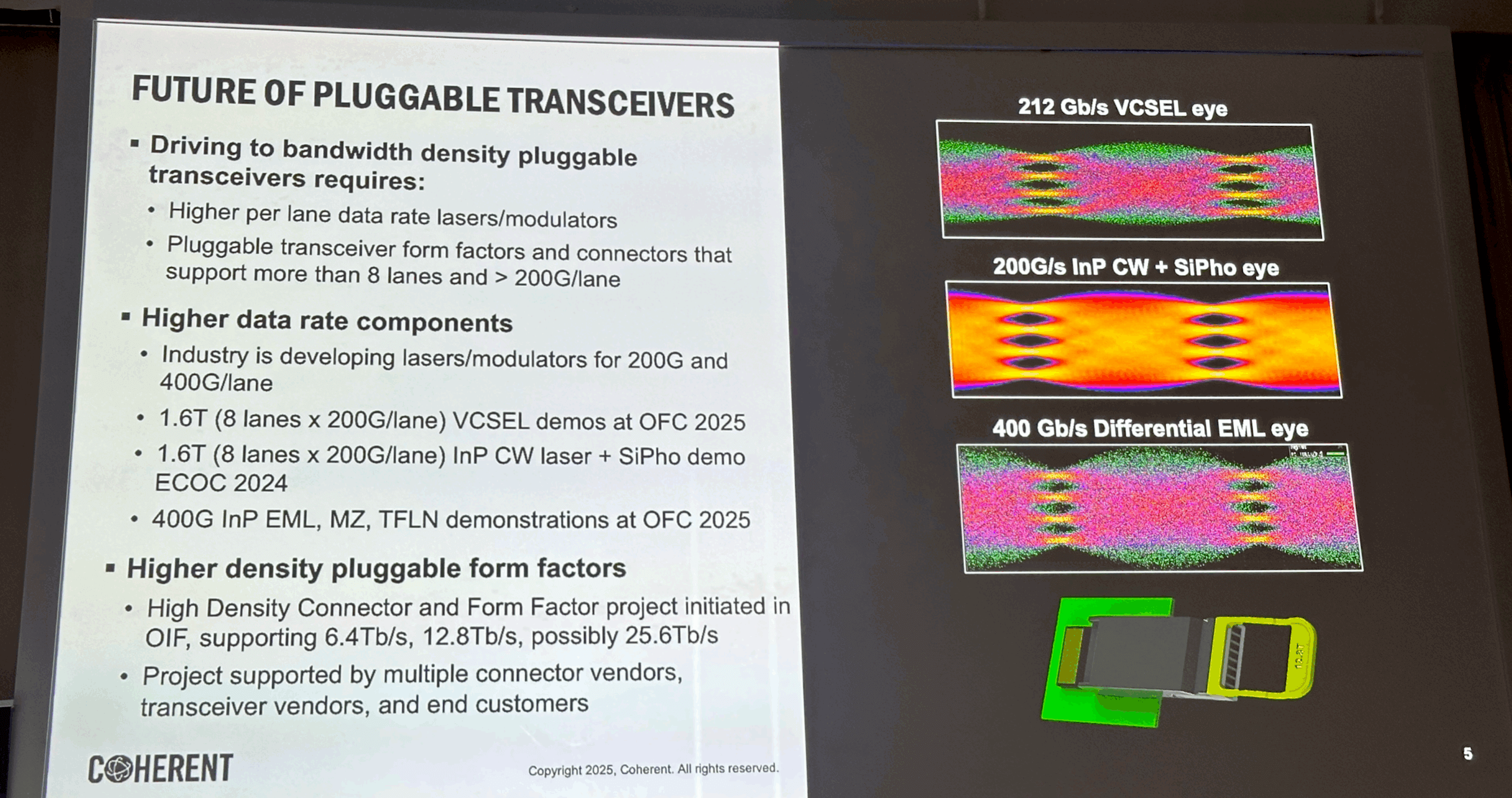 • Next-generation pluggables – higher bandwidth density achieved by raising per-lane data rates and lane counts; Coherent has demonstrated 200 Gb VCSEL, 200 Gb silicon-photonics with InP CW lasers, and 400 Gb InP DML at OFC 2025. The company is contributing to the OIF High-Density Connector form-factor targeting up to 64 lanes.