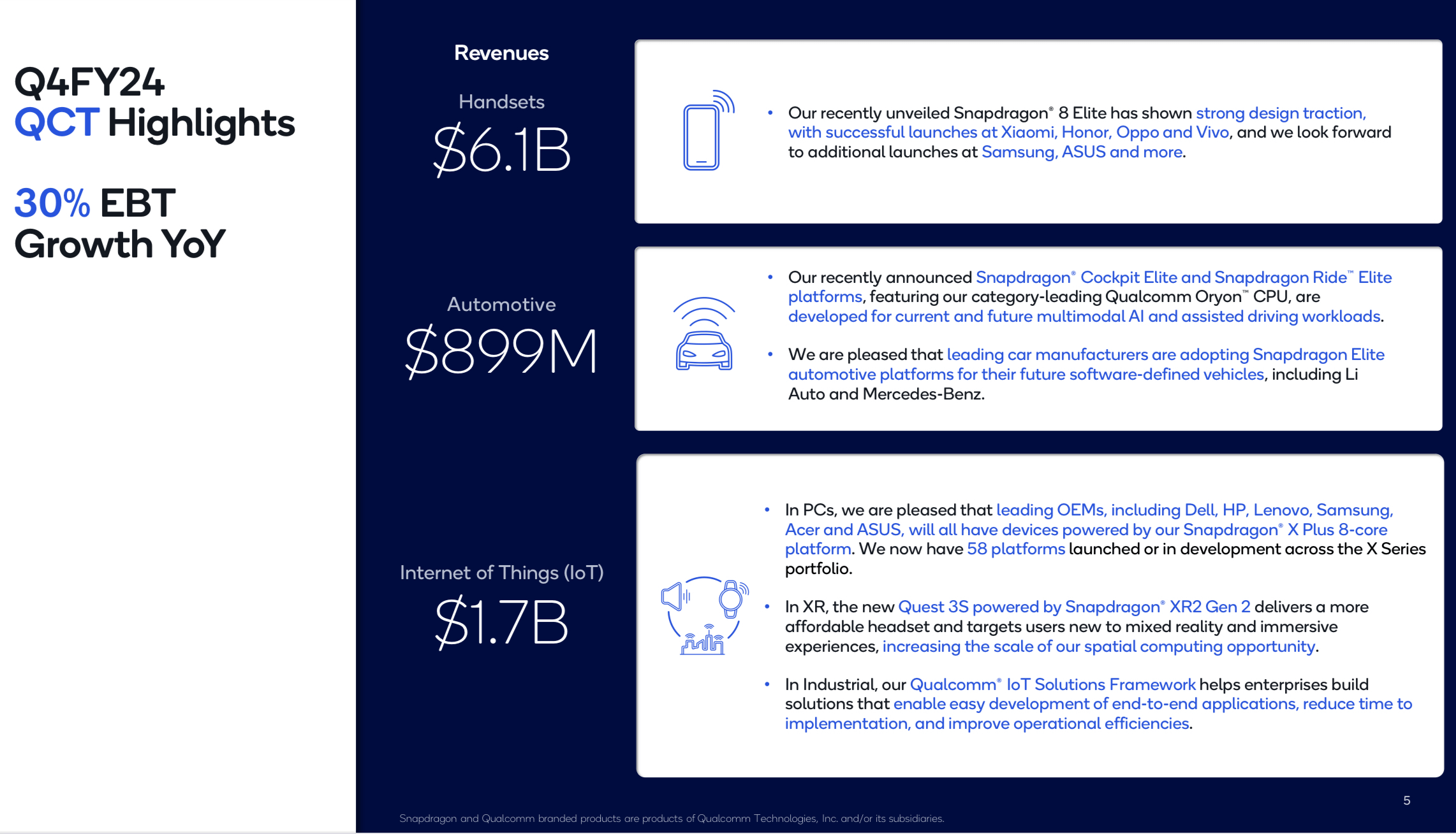 Qualcomm’s QCT (Qualcomm CDMA Technologies) Automotive division reported its fifth consecutive quarter of record revenue, up 68% year-over-year for Q4 and contributing to an annual revenue increase of 55% for this segment. Other significant growth areas include Handsets, with a 12% increase in Q4 revenue, and IoT, which saw a 22% rise. The company’s return of capital to shareholders for the quarter included stock repurchases and cash dividends, supporting sustained investor engagement.