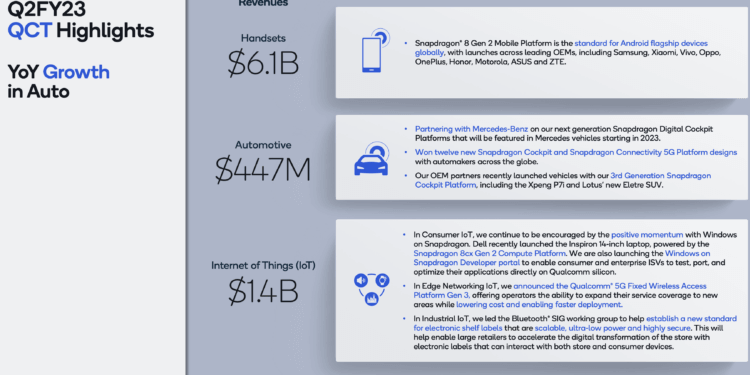 Regarding it outlook for the current quarter, Qualcomm said it expcts “continued impact of the macroeconomic headwinds, weaker global handset units, and channel inventory drawdown. In addition, we estimate a larger-than-normal sequential decline in QCT revenues, primarily due to the timing of purchases by a modem-only handset customer.”