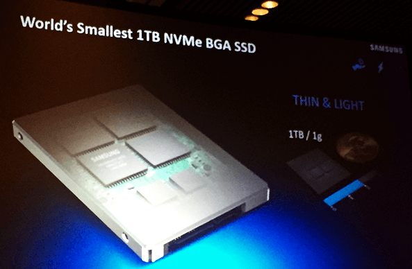 This makes possible 1 TB Flash in a device weighing less than 1g, weighing less than half of a U.S. dime. The Samsung 1TB BGA SSD will use an extremely compact, ball grid array (BGA) package design that contains all essential SSD components including triple-level-cell V-NAND flash chips, LPDDR4 mobile DRAM and a state-of-the-art Samsung controller. It will deliver unprecedented performance, reading sequentially at 1,500MB/s and writing sequentially at 900MB/s.