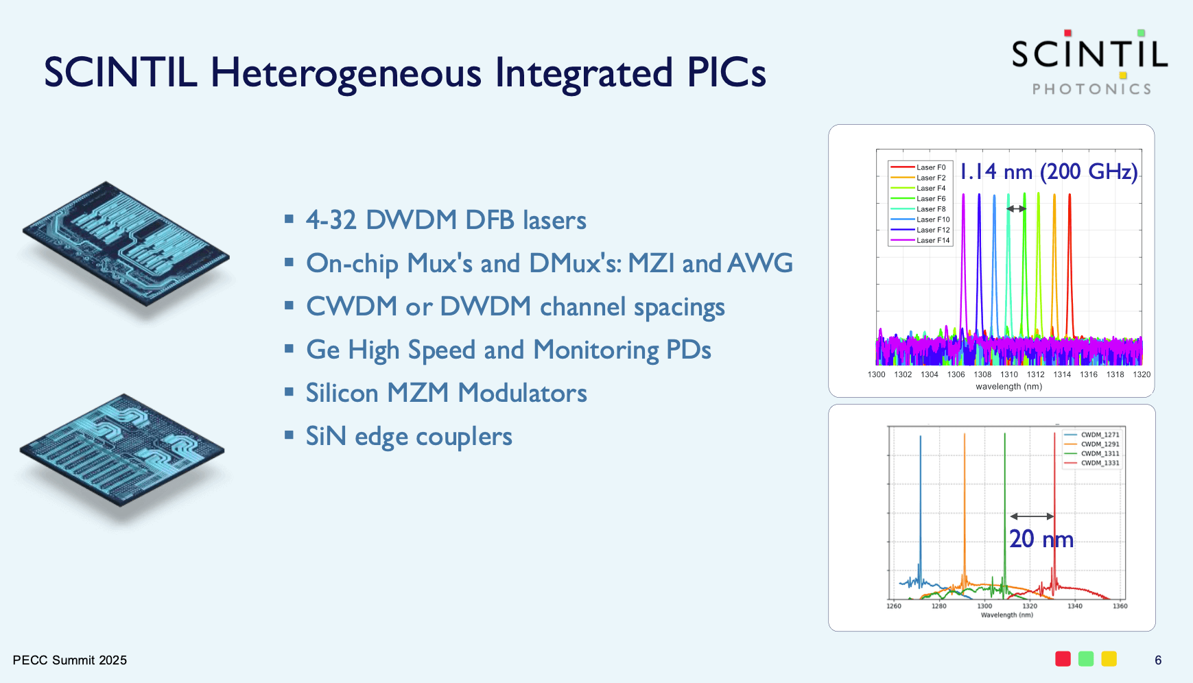 • Heterogeneous integration (Scintil SHIP): Scintil’s Silicon Heterogeneous Integrated Photonics (SHIP) process bonds III–V gain material onto standard silicon photonic wafers using a handle-exchange technique similar to backside-illuminated CMOS sensors. The process enables 4–32 DFB lasers on-die, integrated AWG mux/demux, Ge photodiodes, and SiN edge couplers — delivering a true monolithic DWDM photonic platform.