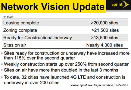 Sprint’s Network Vision program now has over 4,300 cell sites on air and the number either ready for construction or currently being updated has more than doubled in the last three months to more than 13,500. Sprint has completed leasing and zoning permits on more than 20,000 sites. Weekly construction starts are up over 250 percent from the second quarter but the company now expects to bring 12,000 sites on air approximately one quarter later than originally planned.