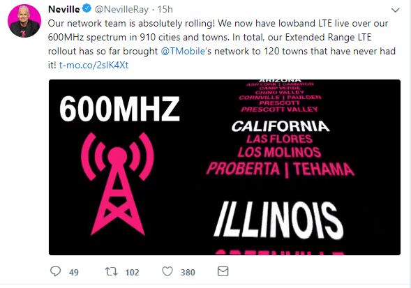 T-Mobile is now referring to its 600 MHz deployment as “Extended Range LTE”, noting that 600 MHz signals travel twice as far from the tower and are four times better in buildings than mid-band LTE.