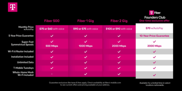 The plans cater to different household needs, starting with Fiber 500 at $60/month with Autopay and a T-Mobile voice line, and scaling up to a Fiber 2 Gig plan priced at $90/month under the same conditions. The most aggressive promotion is the limited-time “Fiber Founders Club” plan, offering 2 Gbps for $70/month with a 10-year price lock and no voice line requirement — available in select markets. All plans include Whole Home Wi-Fi with mesh support for higher tiers and are free from data caps.