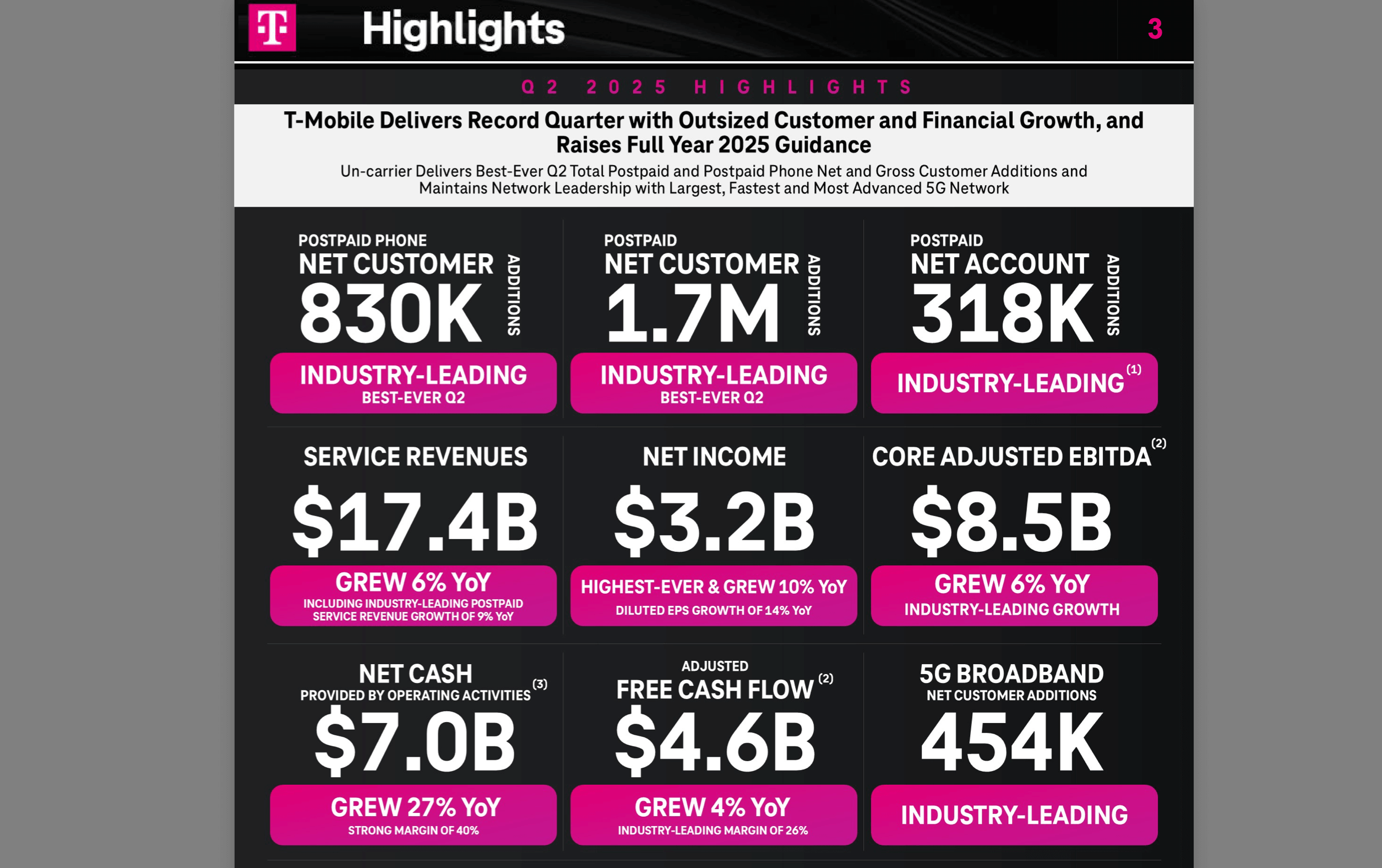 T-Mobile reported service revenues of $17.4 billion (up 6% YoY), net income of $3.2 billion (up 10% YoY), and Adjusted Free Cash Flow of $4.6 billion (up 4% YoY). Core Adjusted EBITDA reached $8.5 billion, also up 6%. T-Mobile returned $3.5 billion to shareholders in Q2. The company raised its full-year 2025 guidance, now targeting 6.1–6.4 million postpaid net additions, and expects to generate up to $18.0 billion in Adjusted Free Cash Flow.