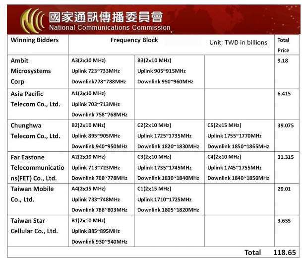 The government of Taiwan raised a total of NT$118.65 billion (US$4.01 billion) in an auction of of 27 0MHz of spectrum in the 700MHz, 900MHz and 1,800MHz bands. The auction exceeded the reserve price by 231%, indicating a pent-up demand for mobile broadband service.