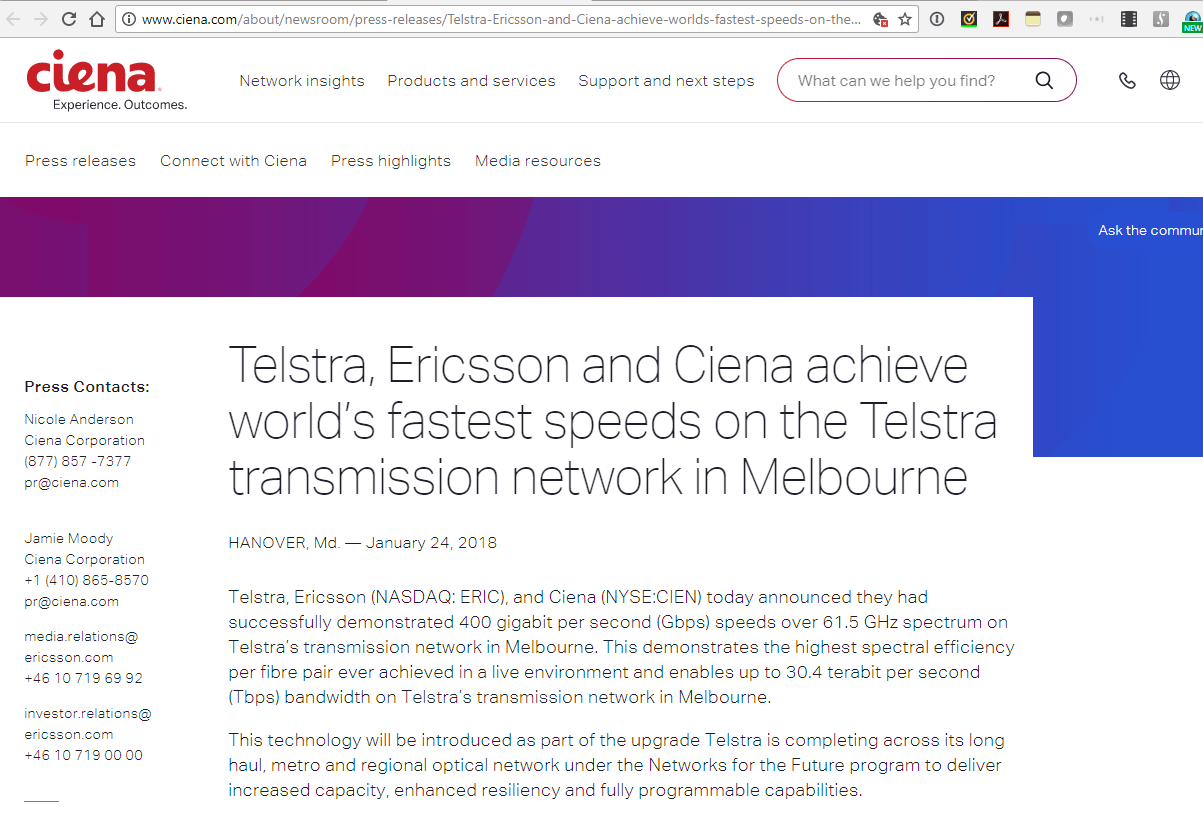 Telstra, Ericsson, and Ciena demonstrated 400 Gbps speeds over 61.5 GHz spectrum on Telstra’s transmission network in Melbourne, attaining what the companies termed “the highest spectral efficiency per fibre pair ever achieved in a live environment.” This implies that a maximum 30.4 terabit per second (Tbps) bandwidth is possible on Telstra’s transmission network in Melbourne. The highest previous mark was 25.6 Tbps.