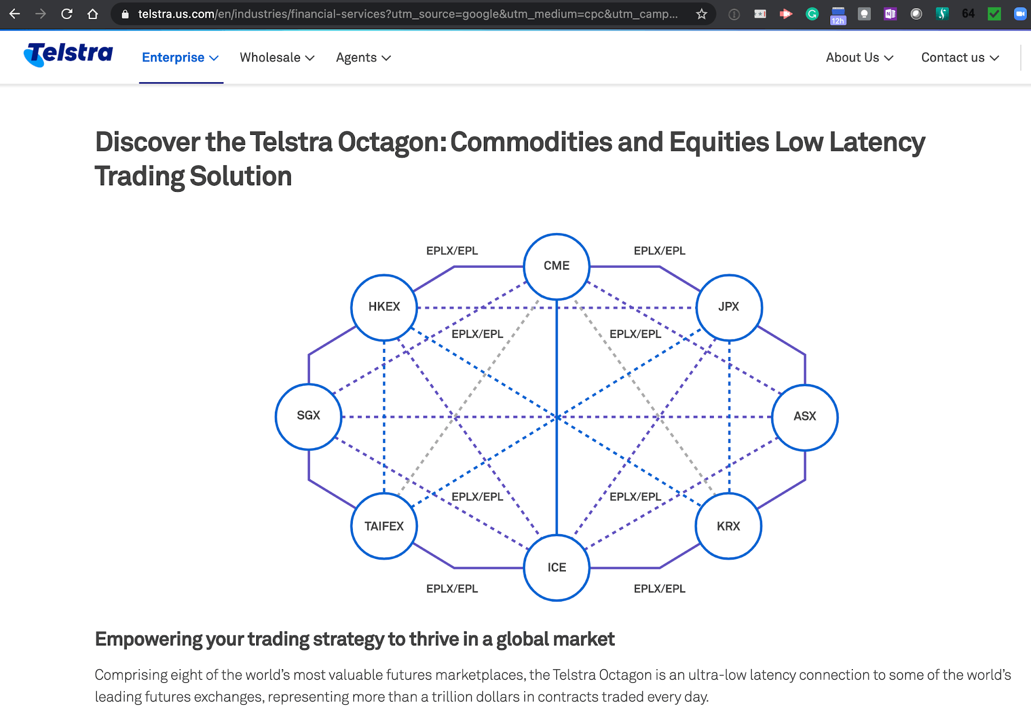 The Telstra Octagon service will provide financial firms with low latency connectivity directly into eight of the world’s most valuable futures and commodities marketplaces. This includes the CME and ICE exchanges in the U.S. as well Australia, Hong Kong, Singapore, Taiwan, South Korea and Japan.