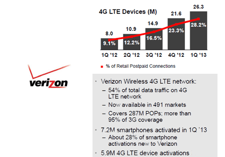 Verizon reported Q1 revenue of $29.4 billion, a 4.2 percent increase compared with first-quarter 2012, and 68 cents in EPS, a 15.3 percent increase compared with first-quarter 2012 earnings of 59 cents per share. Growth was driven by an 8.6 percent year-over-year increase in wireless service revenues, 4.3 percent year-over-year increase in wireline consumer revenues, and a 6.0 percent year-over-year increase in revenues for global enterprise strategic services. Q1 CAPEX was $3.6 billion, flat year over year.