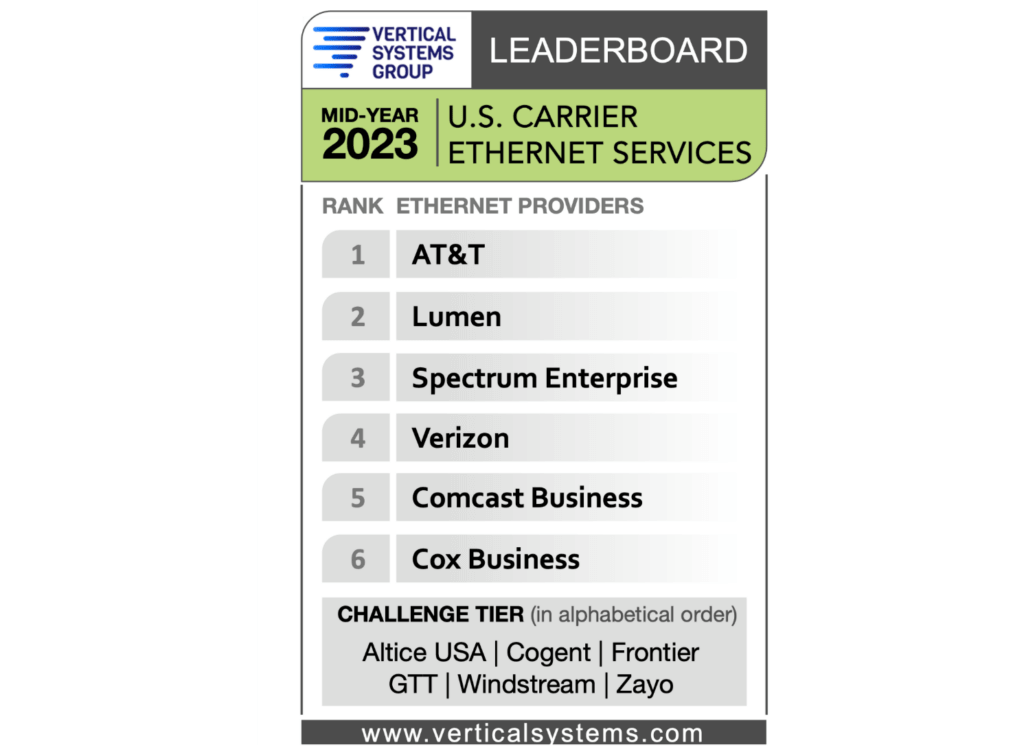 Vertical Systems Group announces that the following six companies achieved a position on the mid-year 2023 U.S. Carrier Ethernet LEADERBOARD (in rank order based on retail port share as of June 30, 2023): AT&T, Lumen, Spectrum Enterprise, Verizon, Comcast Business and Cox Business. Network providers must have four percent (4%) or more of the U.S. retail Ethernet services market to qualify for a rank on this LEADERBOARD.