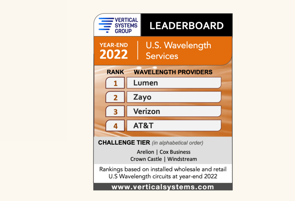 Four companies achieved a position on Vertical Systems Group’s 2022 U.S. Wavelength Services LEADERBOARD (in rank order based on billable circuit share): Lumen, Zayo, Verizon and AT&T.