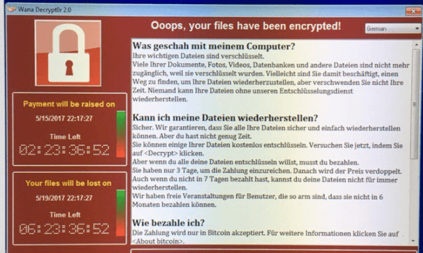 On Friday 12-May-2017 major organizations worldwide fell victim to a rapidly spreading ransomware attack known as WannaCry, WCry, WanaCrypt and WanaCrypt0r.  The ransomeware ecrypts files on the victim’s Windows PC and displays a note demanding $300 or $600 in Bitcoin to unlock the machine. Here’s a roundup: